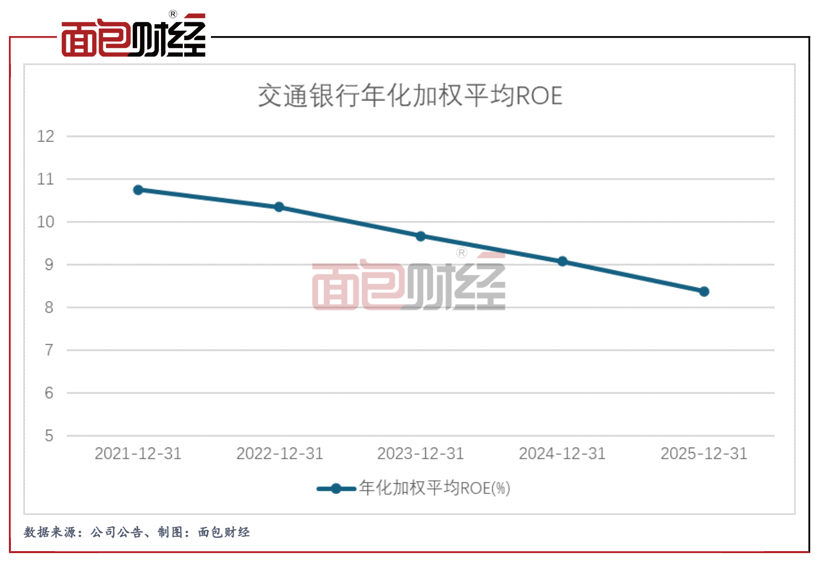 这场分红乌龙风波的余波未平之际,交通银行交出的 2025 年成绩单同样难掩经营隐忧。作为衡量银行盈利能力的核心标尺,2025年交行的加权平均净资产收益率(ROE)降至8.38%,同比下降0.7个百分点,连续多年呈现下滑态势。